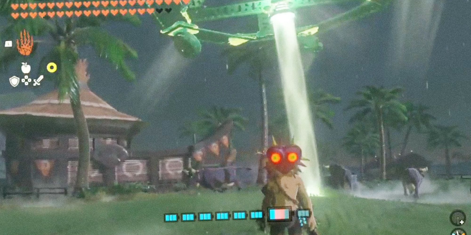 In Majora's Mask, you can take a quest to protect Romani Ranch from aliens. Unlike the usual goblin-types with swords and shields--you know, standard high fantasy stuff--you have to stop floating, ghost-like enemies with light beams who are trying to abduct cows. So, of course, someone decided to bring that vibe back in Tears of the Kingdom with a fully-functioning UFO and Majora's iconic Mask.